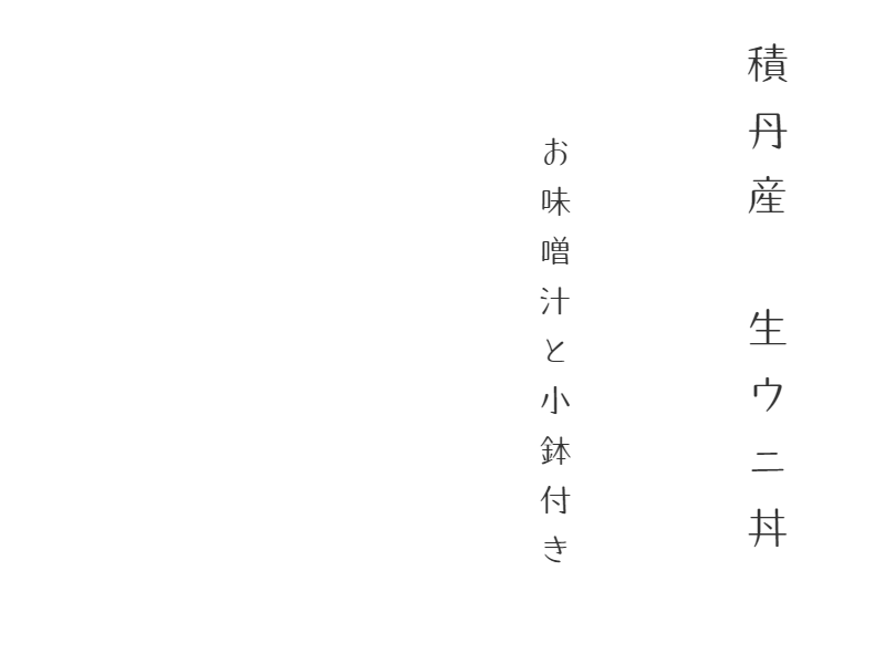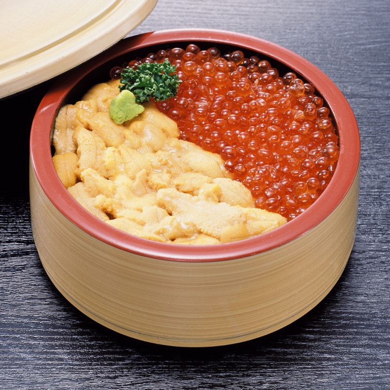 ウニ本来の持つ甘みが存分に味わえる生ウニ丼。色、艶、甘みの良いウニを厳選して使用しております。また仕入れたウニは当店の塩水で洗い上げ、さらに甘みに磨きをかけていきます。当然、ミョウバンなどの添加物は一切使用しておりません。本物の生ウニの味をぜひご賞味ください。